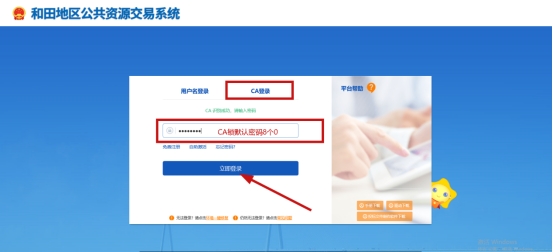 1、竞买人打开公共资源交易平台,点击交易主体登录,点击右上角密码登录,选择CA登录”进入系统(翔晟CA初始密码:00000000 新疆CA初始密码:123456),首先完善本单位信息: